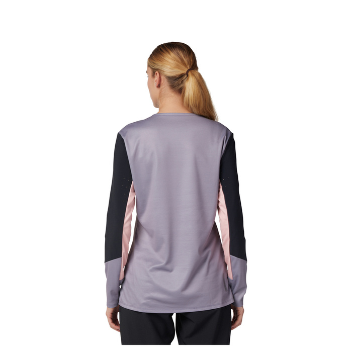 Damska koszulka rowerowa z długim rękawem FOX LADY DEFEND - Stworzona do zjeżdżania po trasie z prędkością błyskawicy i wyglądająca równie imponująco. Dzięki tkaninie TruDri®, która odprowadza pot i utrzymuje świeżość, koszulka rowerowa Defend wykonana jest z materiałów z recyklingu, jest skrojona idealnie do jazdy po trasie, ma miejsce na ochraniacze oraz posiada przedłużony tył.