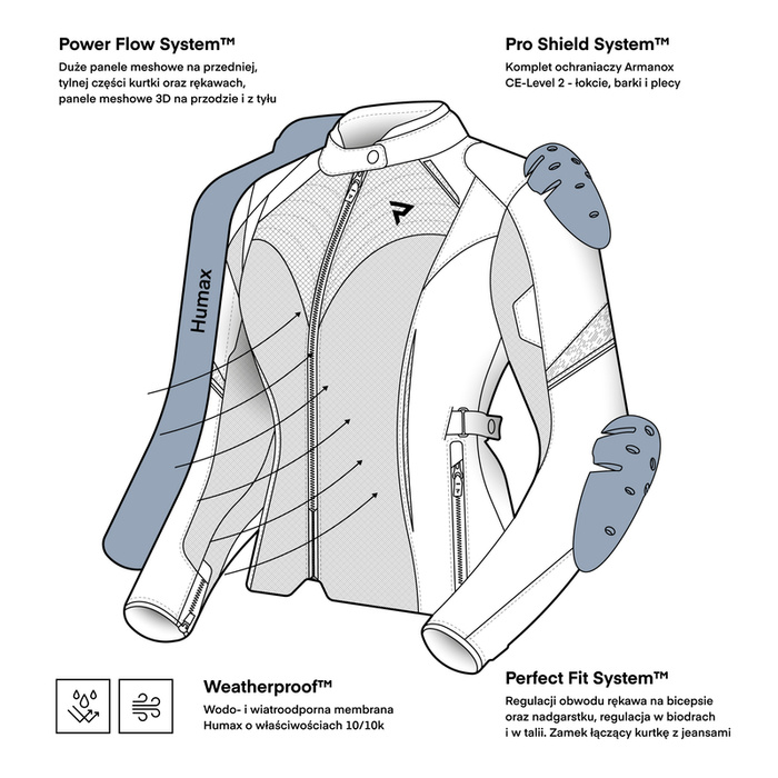Kurtka JAX LADY jest wyposażona w zestaw ochraniaczy Armanox CE-level 2, w tym ochraniacz pleców. Spełnia wymogi drugiego poziomu ochrony, który obejmuje całą kurtkę (AA).