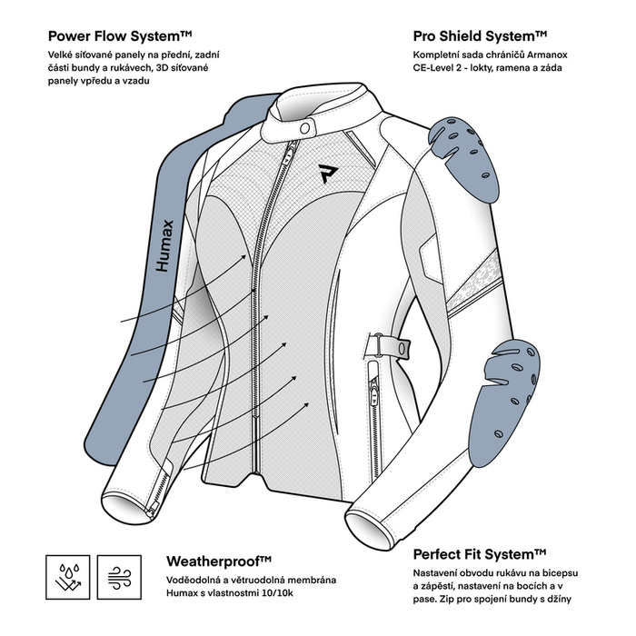 Wytrzymałe materiały wysokiej jakości gwarantują bezpieczeństwo, a przewiewne panele 3D mesh oraz steel mesh zapewniają świetną wentylację bez utraty wytrzymałości. Dzięki membranie HUMAX® o parametrach 10k/10k, kurtka JAX LADY zapewnia optymalną ochronę przed warunkami atmosferycznymi.