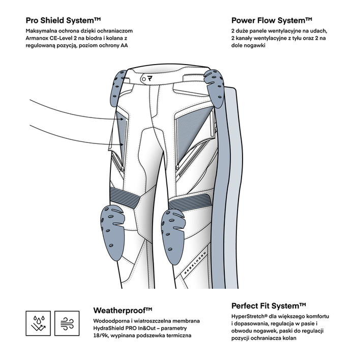Dzięki wypinanej membranie HydraShield™ PRO in&,out oraz ocieplinie, Hardy 3.0 sprawdzą się zarówno w deszczowych, jak i chłodniejszych dniach. Idealnie współgrają z kurtką Hardy 3.0, tworząc kompletny zestaw dla wymagających motocyklistów.